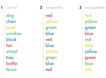 If you're literate and don't have color blindness, you probably found the "control" words easy, the "compatible" ones even easier, and the "incompatible" ones… maybe not hard, but you were slower to do it. The word being in conflict with the color of the font makes it harder to name the color of the font.