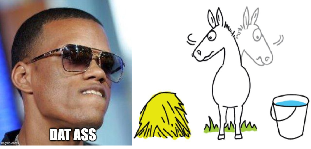 Other writers satirized this with the idea of a donkey (yes, that kind of ass, sicko) that was equally thirsty and hungry. Standing between a pail of water and a bale of hay, Buridan's ass, with two equally good options, wouldn't be able to choose between them and die of starvation and thirst.